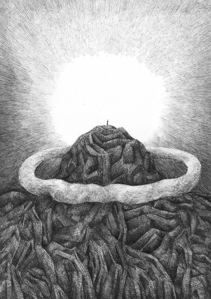 Góra, chmura, takie tam zachody słońca, tusz na papierze, 42×29,7cm