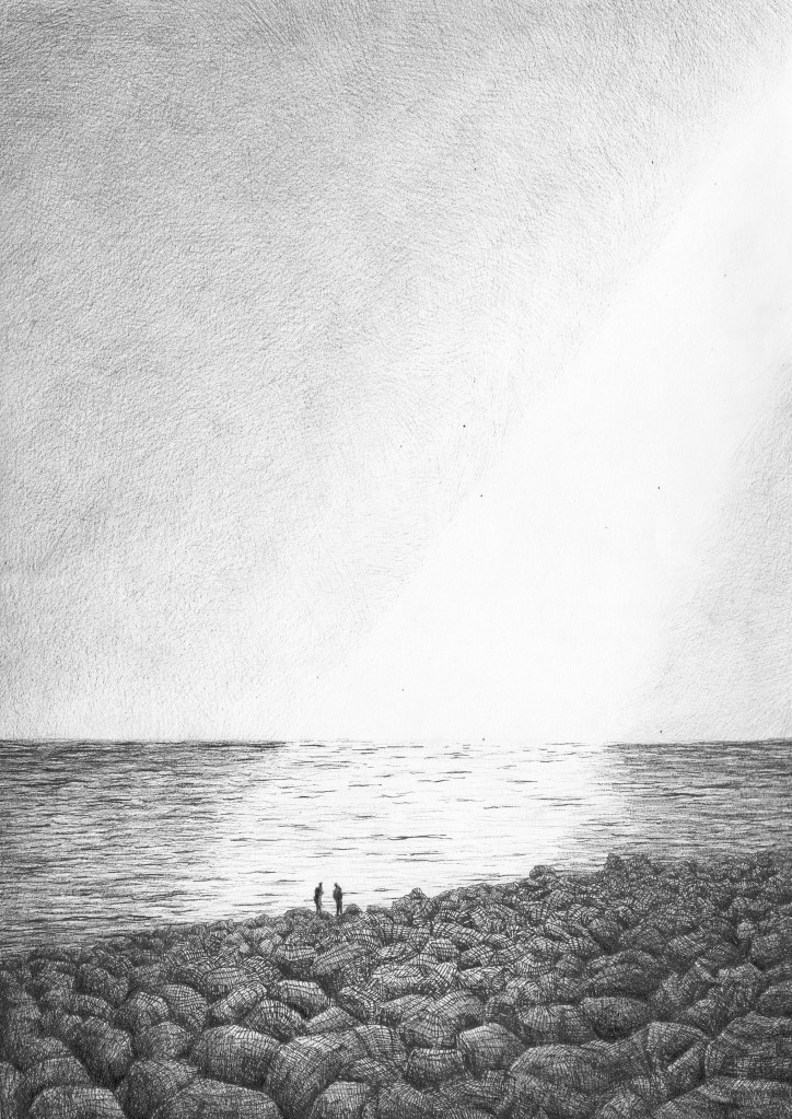 Księżyc w zenicie, ja u Alicji na tarasie, tusz na papierze, 42×29,7cm