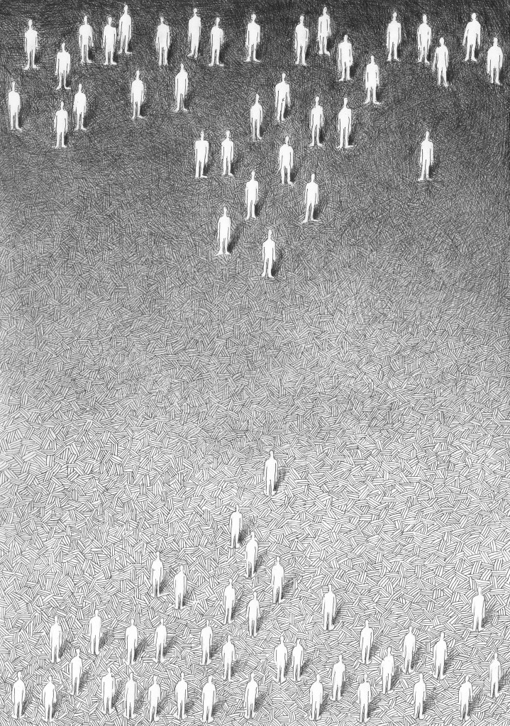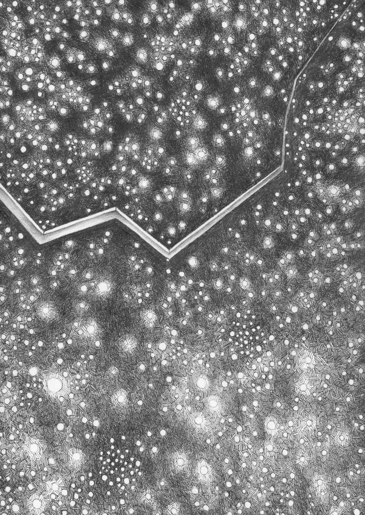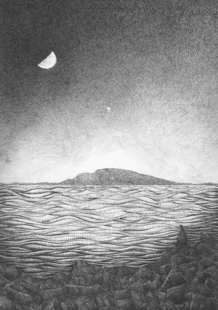 Coś jakby zaćmienie, ale jednak nie. Wystarczy narysować oko i od razu zmienia się perspektywa, tusz na papierze, 42×29,7cm