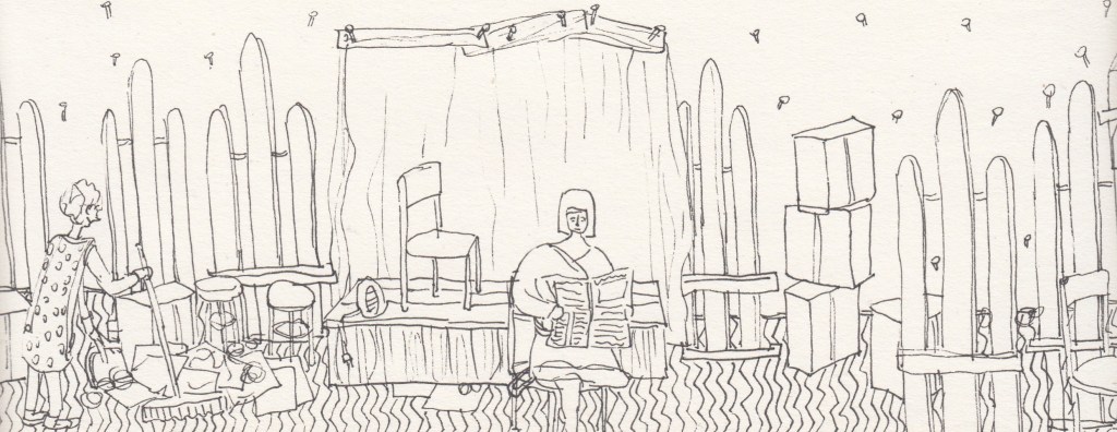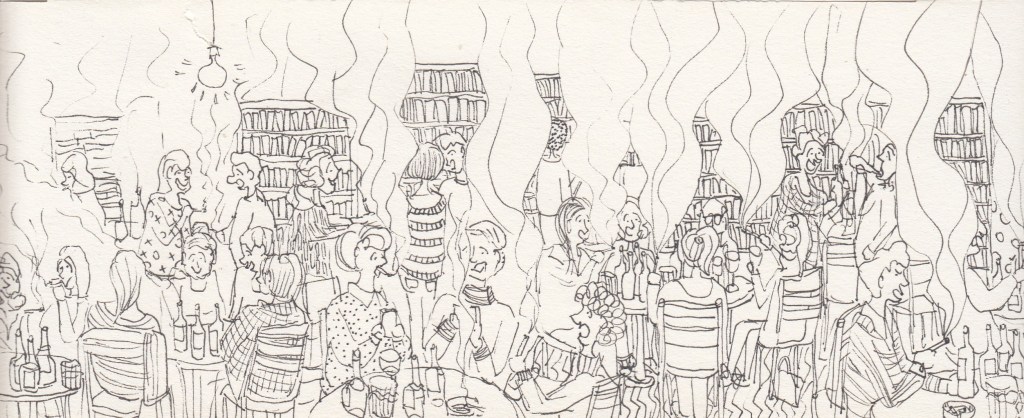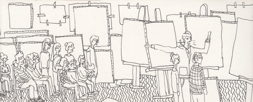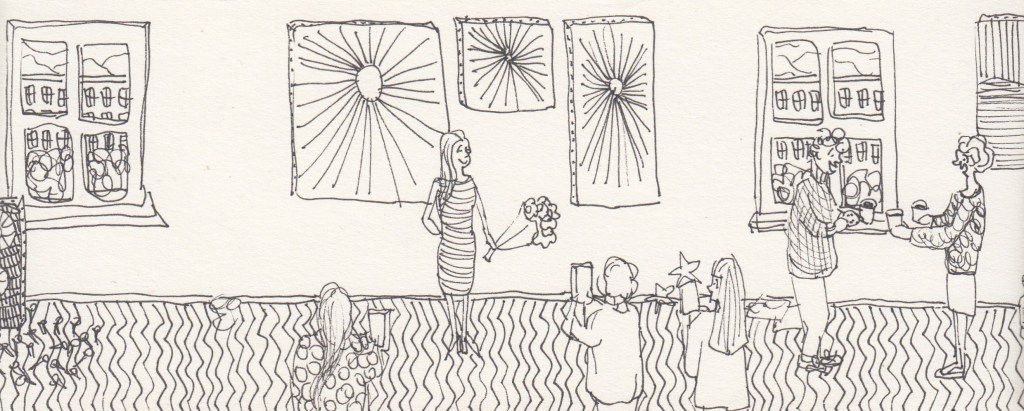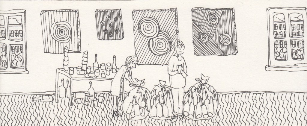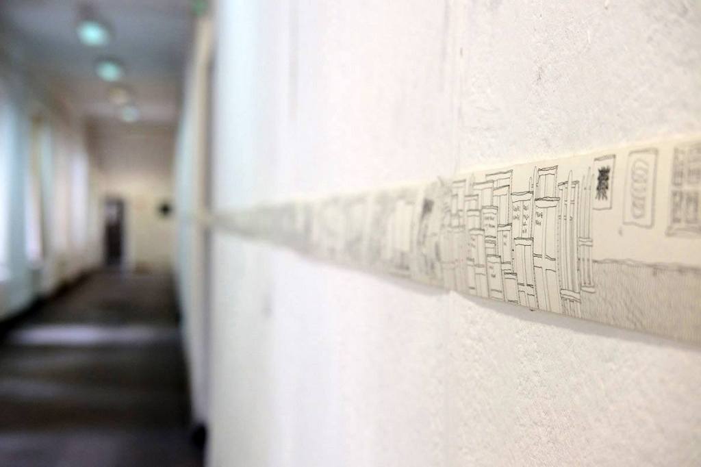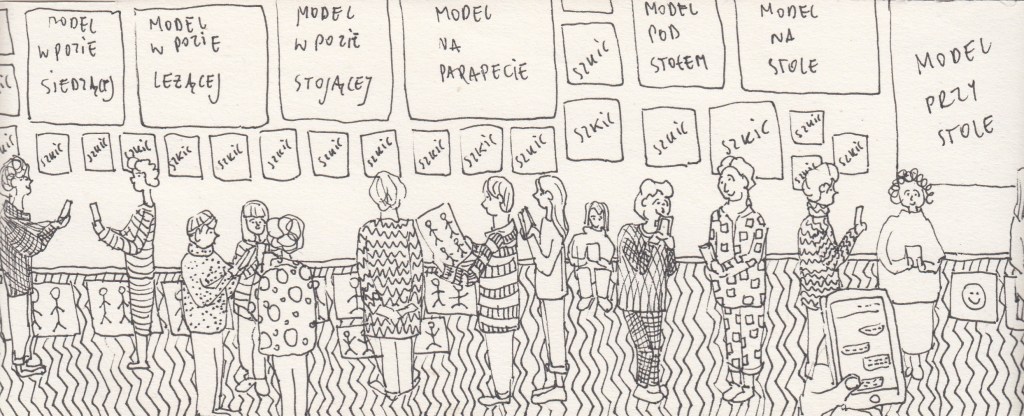 Praca „Coś tam, kiedyś tam, gdzieś tam…” jest aneksem do mojej pracy dyplomowej. Jest to opowieść o tym, jak wyglądały moje studia na Akademii Sztuk Pięknych w Warszawie, jak to wszystko wyglądało od kuchni. Rysowana trochę z przymrużeniem oka, ale szczerze. To swego rodzaju podsumowanie i rozrachunek, a teraz, już po dyplomie, miłe wspomnienie studenckich lat. Rysunek został zrobiony w nietypowym rozmiarze, jego długość to 30 metrów. Na obronie dyplomu zawisł na korytarzu Akademii, tak że komisja musiała odbyć spacer, żeby zapoznać się z moim dziełem. Niestety, pracę o takich rozmiarach najlepiej oglądać na żywo, bardzo trudno pokazać ją w wersji cyfrowej (30 metrów rysunku!). Jako że przypomina ona taśmę filmową, została przeze mnie nagrana i może być oglądana na ekranie komputera jako coś w rodzaju animacji. Praca wykonana w 2018 roku.
