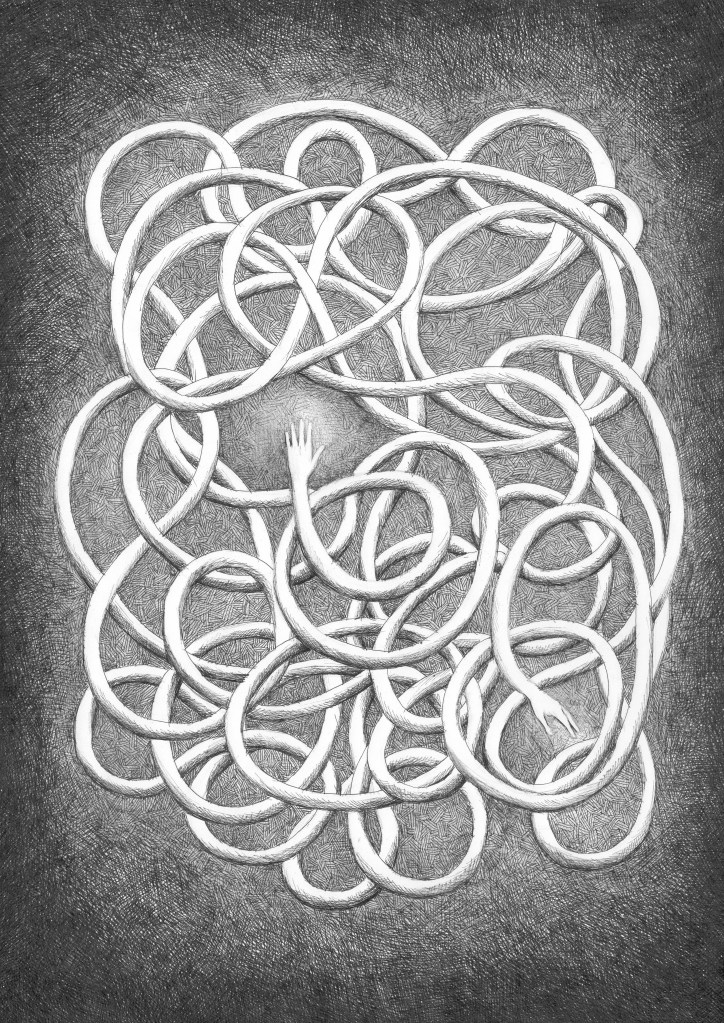 Jak się z tego wyplątać? tusz na papierze, 42×29,7cm