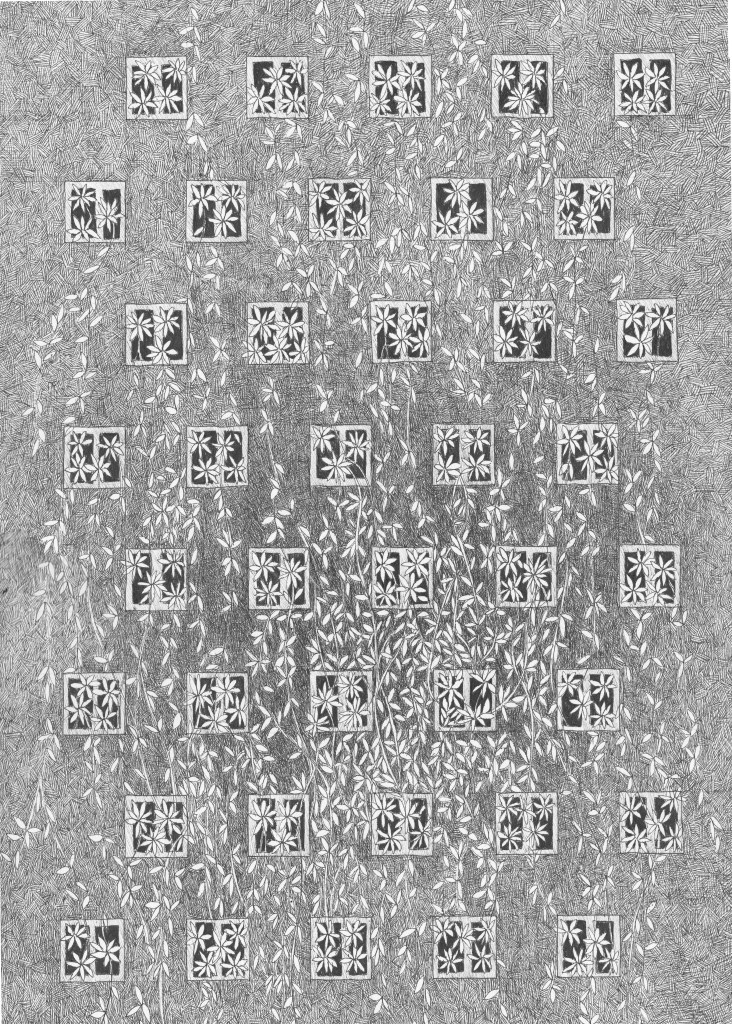 Klasycznie rośliny opanowują budynek, tusz na papierze, 42×29,7cm Wystawa Smutek kątów prostych oficjalnie jeszcze do 9 lutego (a będzie do końca lutego), Kasprowicza 14, Warszawa Zrealizowano w ramach stypendium Ministra Kultury i Dziedzictwa Narodowego