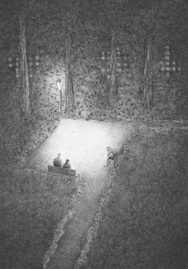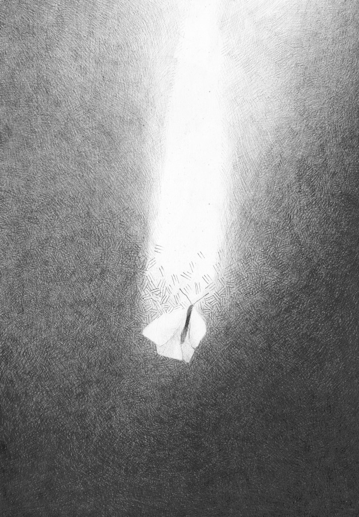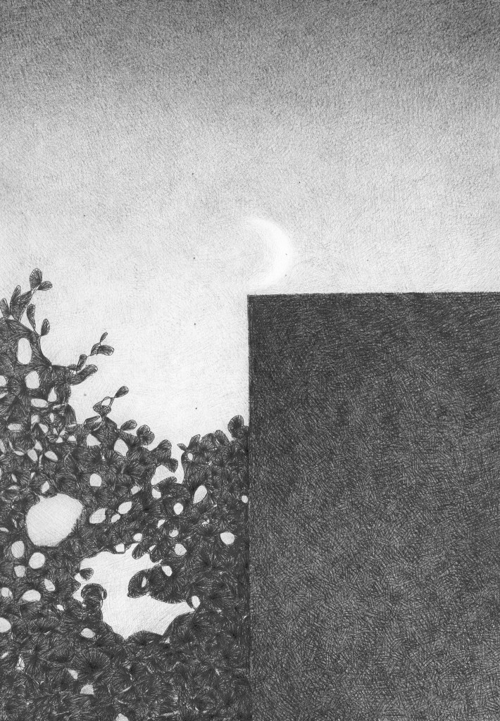 To powinno być w kolorze, bo to był ładny moment, improwizowałam na pianinie, był zmierzch i jak się odwróciłam, to zobaczyłam księżyc, który parę minut później schował się za blokiem, no ale, już nie pamiętam kolorów, tusz na papierze, 42×29,7cm