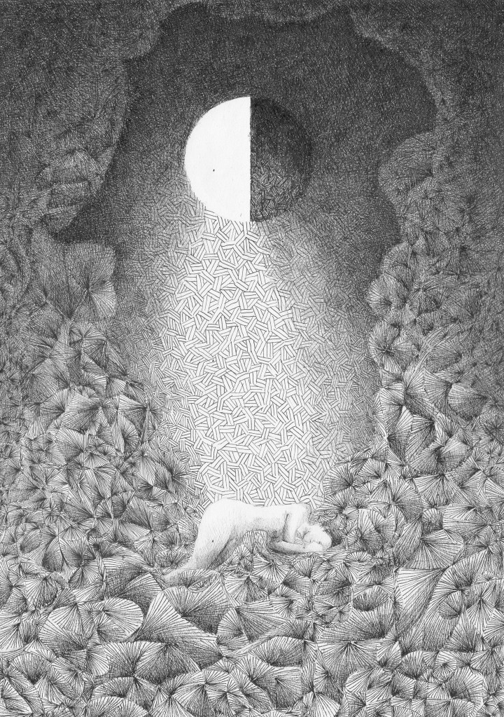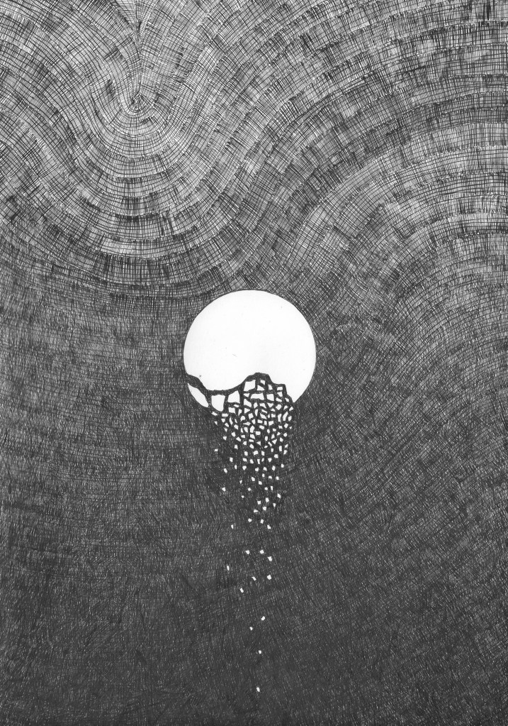 Idę sobie na spacer, a tu księżyc idealnie nad budynkiem. Rysunek z cyklu Smutek kątów prostych, ale w sumie nie taki smutny, tusz na papierze, 42×29,7cm
