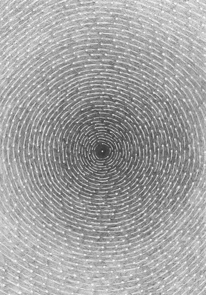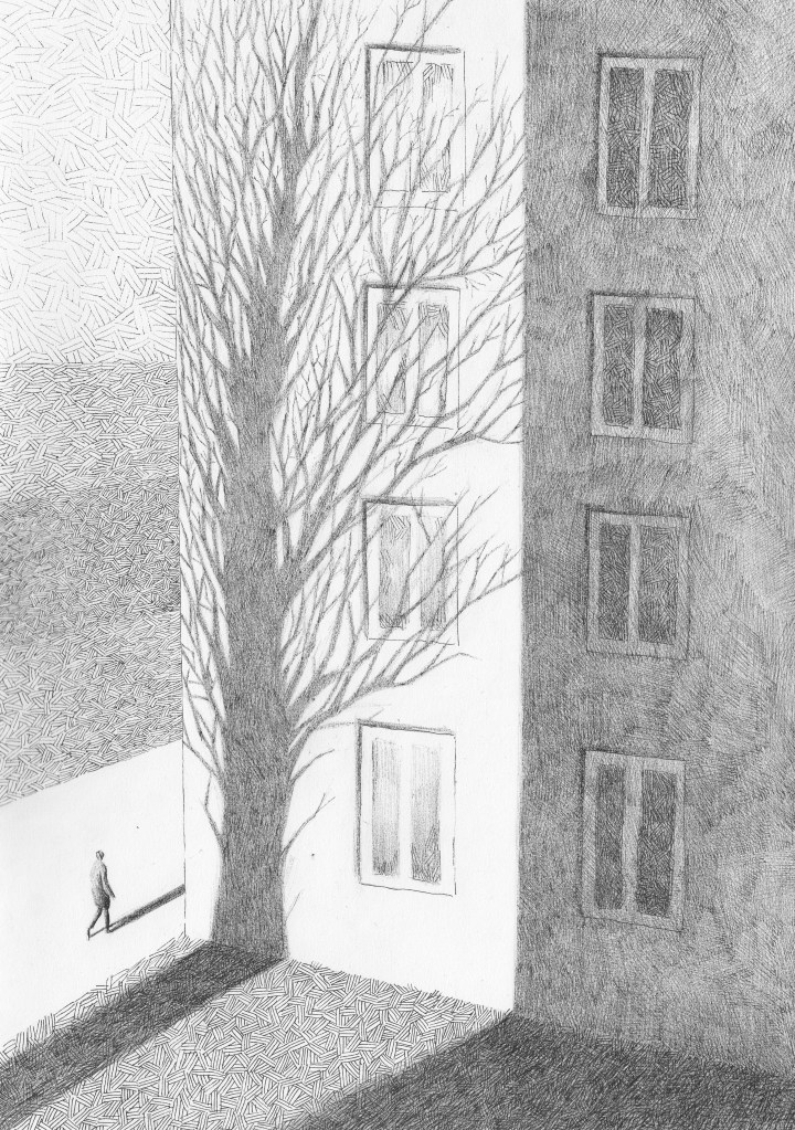 Smutek kątów prostych, tym razem dużo okien, a w każdym oknie inna historia, tusz na papierze, 42×29,7cm